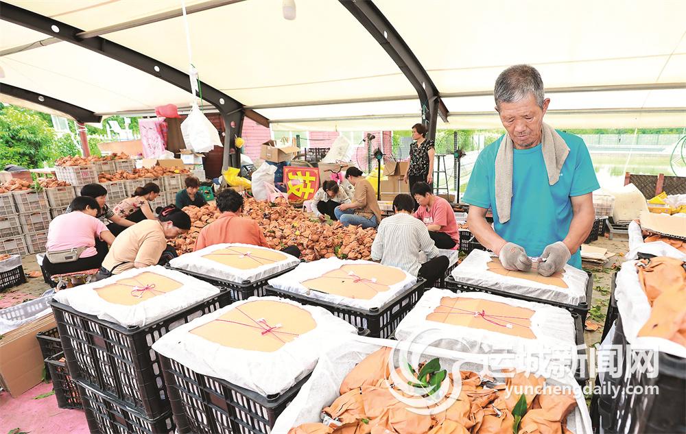 在分揀中心,小山般的桃子堆前,十幾名工人忙著分揀、裝箱、包裝、封口。兩個大號電風扇在一旁歡快地轉動,呈現出一派忙碌且歡樂的景象。