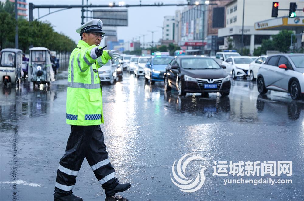 8時許,在中心城區(qū)華聯(lián)崗,鹽湖交警大隊四中隊民輔警穿著反光雨衣,冒著大雨堅守崗位,通過“紅藍燈”閃爍、“熒光綠”值守等方式,指揮車輛有序通過。