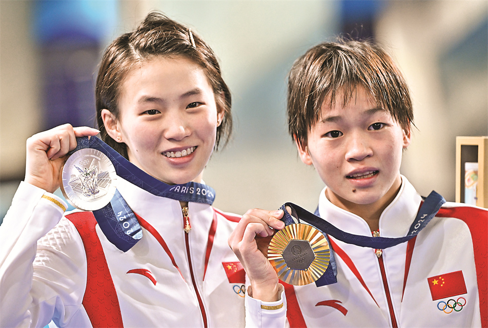 8月6日,全紅嬋(右)和陳芋汐展示獎(jiǎng)牌。