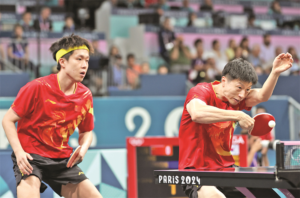 8月7日,中國組合馬龍(右)/王楚欽在比賽中。他們3比0戰(zhàn)勝韓國組合趙大成/張禹珍。