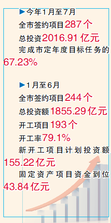 今年1月至7月,全市簽約項目287個,總投資2016.91億元,完成市定年度目標任務的67.23%。其中,1月至6月,簽約項目244個,總投資額1855.29億元;開工項目193個,開工率79.1%;新開工項目計劃投資額155.22億元;固定資產項目資金到位43.84億元。綜合指標排名全省第一。