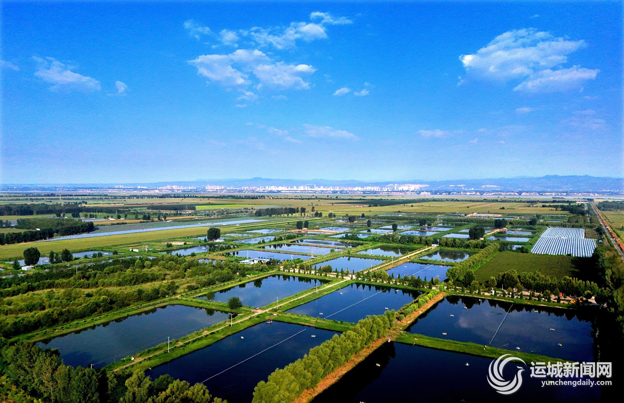 8月27日,無人機在高空定格萬榮汾河灘涂畫面。星羅棋布的魚塘、茂盛的樹木和農作物,在藍天白云映襯下,呈現出一幅生機盎然的美麗生態圖景。 特約攝影 張懷心