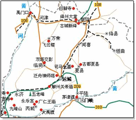 運城,古稱河東,位于山西省西南部,地處晉陜豫黃河“金三角”地區,與河南省三門峽市、陜西省渭南市隔河相望,是中華民族和中華文明的重要發祥地之一。春秋時統屬晉國,晉獻公于公元前669年定都于絳(今絳縣)。韓、趙、魏三家分晉后,運城屬魏,當時,魏國的都城在安邑(今夏縣禹王城一帶)。秦始皇統一中國,設36郡,運城屬河東郡,治所安邑。以后兩千多年,建置頻繁,但一直沿用“河東”這一稱謂。運城,因“鹽運之城”而得名,它是中國唯一一座因鹽而建立起來的城市,史稱“鹽運專城”。