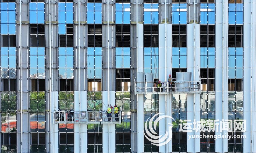 近日,建筑工人在稷山縣工人文化宮建設項目施工現場進行外部裝飾,加速推進項目建設。
