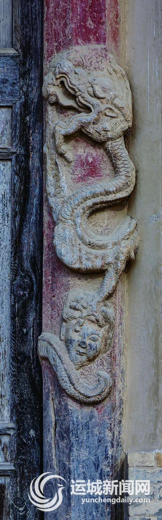 郭村泰山廟大殿的蟠龍石雕柱,更是匠心獨運,通體浮雕神龍,須眉怒張,張牙舞爪,周身云霧翻騰。每條神龍的龍爪上都刻有一個人頭,一男一女。民間相傳,“龍爪人頭”是因為在家不賢不孝,出門干壞事,成了罪人,于是被神龍抓去腦袋!民間之所以有“龍抓人頭”的傳說,且久傳不衰,大抵是因為百姓崇拜神龍,把懲罰邪惡、治罪惡人這樣的義舉,寄托給無所不能的神龍。