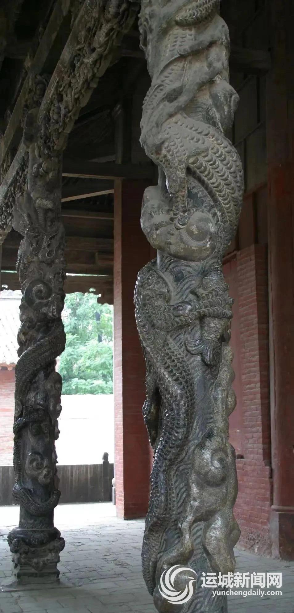 巍然聳立于運城關王廟山門前后檐下的蟠龍柱,是這座古老廟宇中極具特色的建筑元素之一。蟠龍柱共計8根,每一根都顯得蒼勁有力,仿佛蘊含著無窮的生命力。