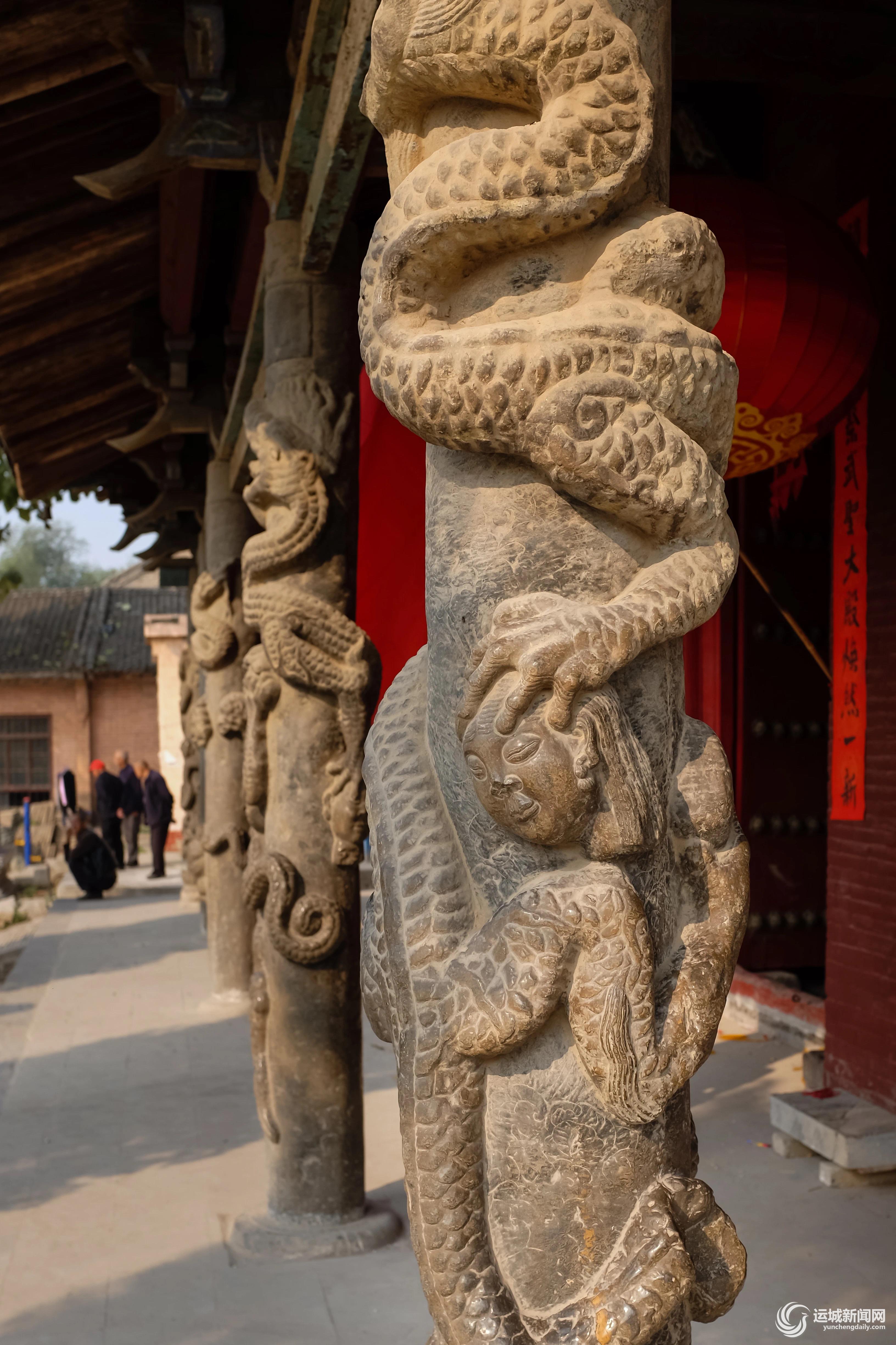 此處蟠龍石柱數量是全國宮殿廟宇之最。廟內碑文記載:“殿階石柱,雕龍飛騰。廟貌宏麗,甲于天下。”