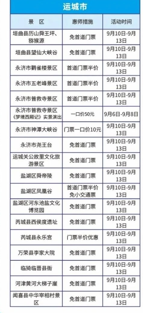 9月10日至13日,太原植物園、忻州蘆芽山、長治通天峽、呂梁蔡家崖、臨汾晉國博物館和永濟鸛雀樓51個歷史文化景區、紅色革命紀念館及自然風光景點,在教師節期間推出免票或門票半價等優惠活動。其中,包括我市18家景區。