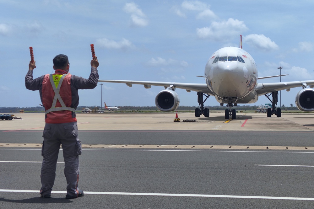 9月8日,在海口美蘭國際機場,機務人員指揮飛機進港停泊。