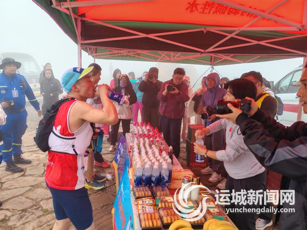 8時59分,第一位選手到達舜王坪補給點,此時風雨似乎更強了一些。工作人員早已貼心地備好熱水、功能飲料、點心、水果等各種物資,在寒風中靜候各路高手,為他們送上最給力的支持。一句句問候、一聲聲加油讓他們在風雨中倍感溫暖。