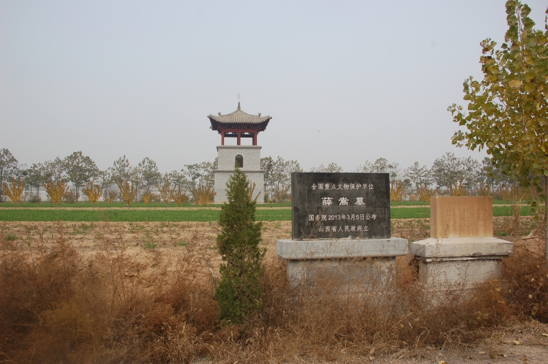 薛嵩墓位于水頭鎮大張村西300米處。東西500米,南北200米,分布面積約100000平方米。薛嵩(?-772),河東萬泉(今山西省萬榮縣)人,薛仁貴之孫,曾任尚書右仆射、相州(河南省安陽市)刺史,昭義軍節度使、封平陽郡王。墓地坐北面南,現存圓形封土1座,底徑約24米,高約3.5米。墓前500米處立唐大歷八年(773)神道碑1通,碑為青石質,螭首、方座。通高6、3米,碑文隸書,記載了薛嵩的生平事跡,由程浩撰文,韓秀實書丹。1965年,省政府公布為省級文物保護單位。2013年5月,國務院公布為全國重點文物保護單位。2015年,爭取到專項經費新建碑樓一座,對薛嵩神道碑進行了妥善保護。