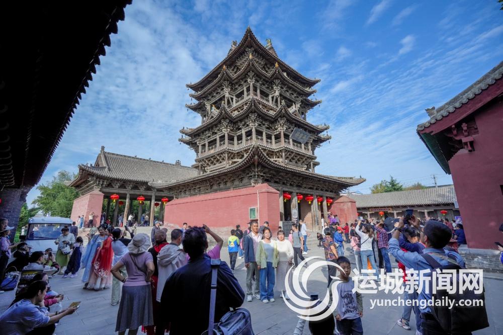 10月4日,游客在萬榮縣東岳廟參觀純木質樓閣建筑飛云樓。國慶假期,我市國寶古建筑吸引了眾多游客前來探訪,感受歷史文化的魅力。 本報記者 閆 鑫 攝