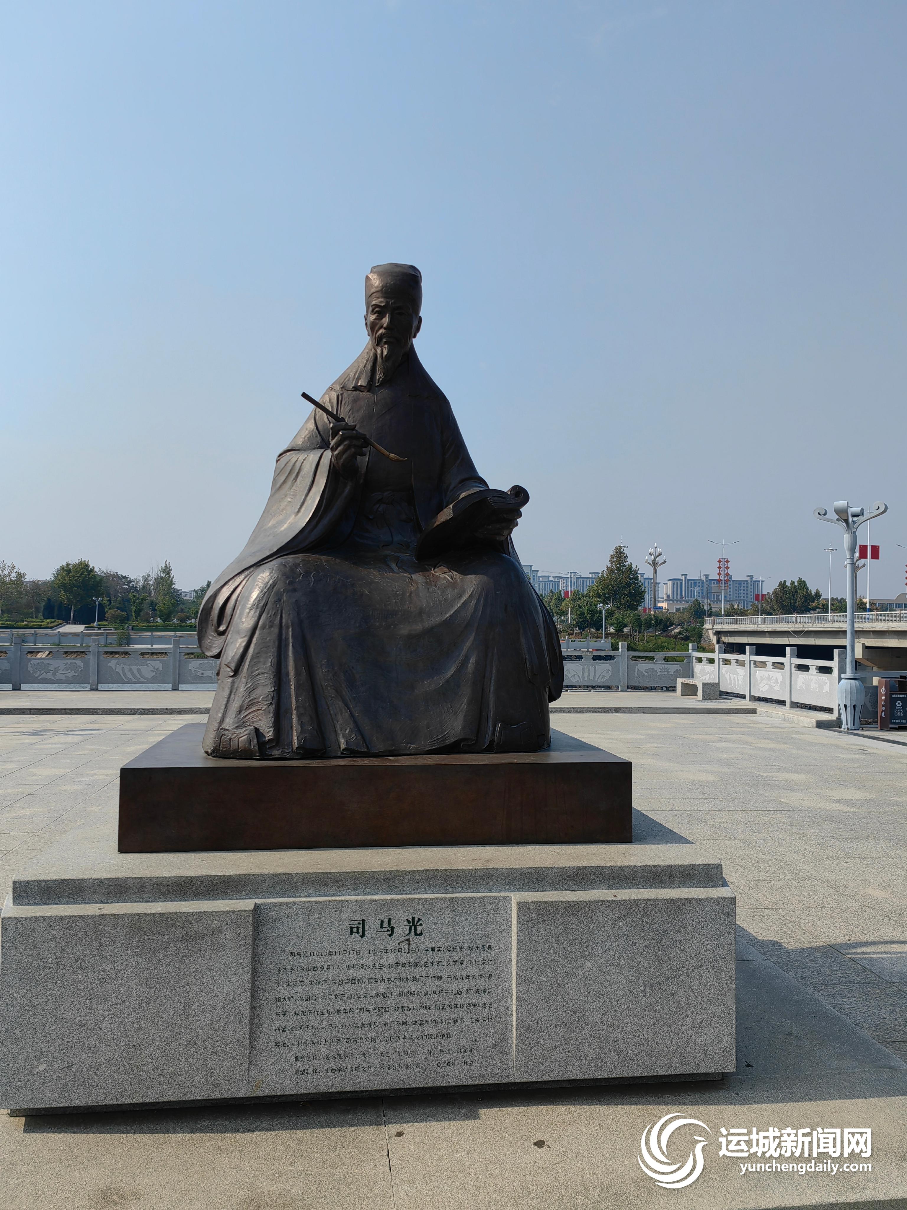 走進白沙河畔的廣場,迎面看到的是一個巨大的雕塑,名為“歷史長河中的一葉扁舟”,光聽名字,就足以讓人聯(lián)想到夏縣與中國古代歷史的深厚淵源。地面上刻著司馬光《資治通鑒》手稿,細看手稿上的文字,一股厚重的歷史文化氣息撲面而來。
