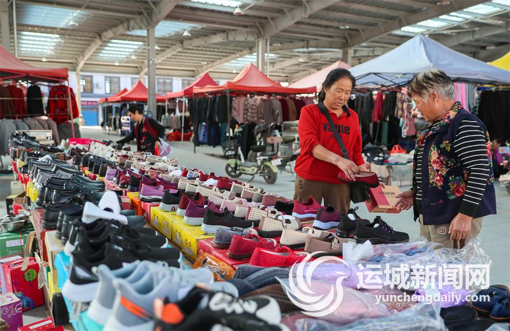夏縣廟前鎮集貿市場內,村民在馬大姐的鞋攤旁選購鞋子。