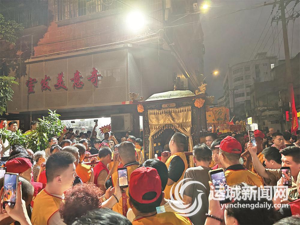 在巡游隊伍中,福建非遺民俗“官將首”為圣像開道,當地的軍鼓隊、涼傘隊、舞獅隊、舞龍隊、腰鼓隊等多個方陣組成一條蜿蜒的“巨龍”,伴著“關帝圣像”繞境踩街。圣像所到之處,人群如潮水般涌來,歡呼聲此起彼伏,場面頗為壯觀。行至夜晚,巡游熱度未減半分,熱鬧的氣氛感染了在場的每一個人。