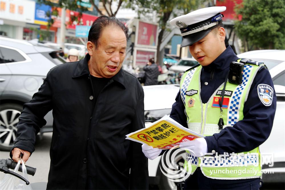 為進一步提高群眾的文明交通素質,凈化道路交通環境,10月21日,鹽湖公安分局交警大隊組織城區中隊民警積極開展“禁止翻越護欄”主題勸導宣講活動。圖為民警在轄區路段進行勸導宣傳教育。