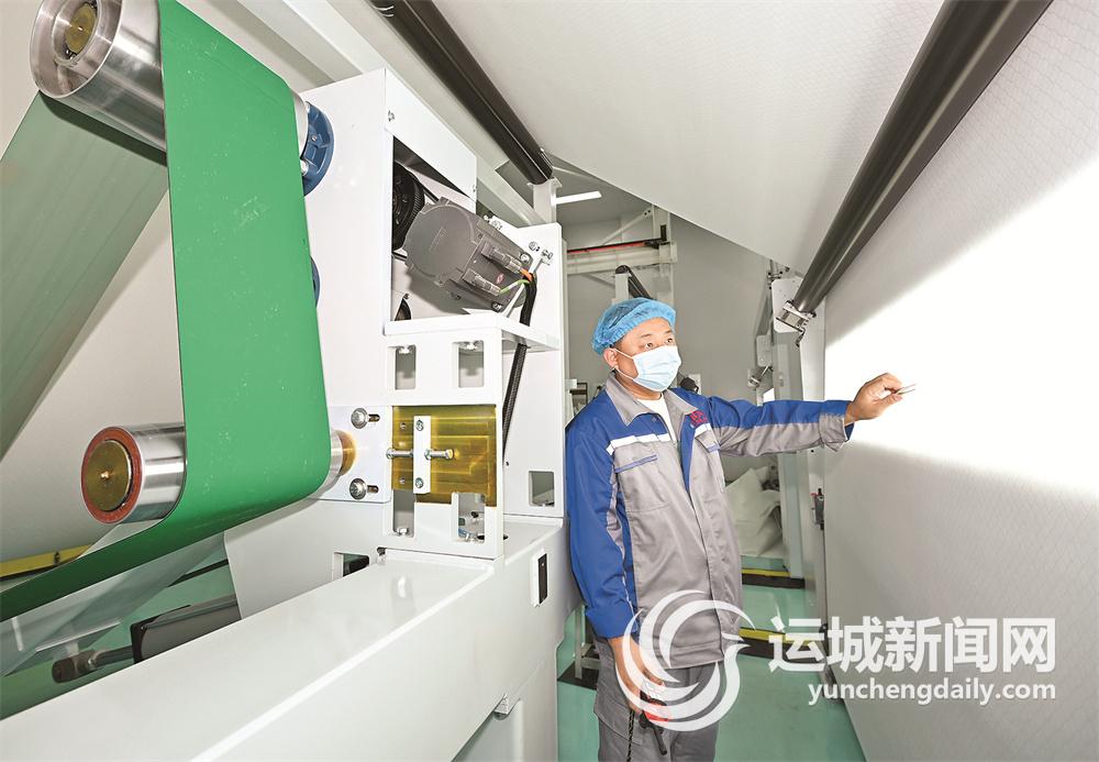 10月31日,在臨猗縣源泰熱能有限公司生產(chǎn)車間內(nèi),工人在生產(chǎn)可沖散可降解無紡布產(chǎn)品。