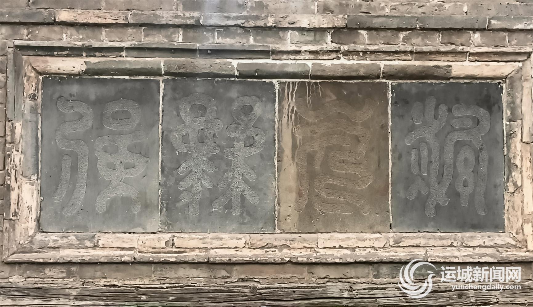 絳守居園池有一青磚砌成的影壁,影壁中間是一個六角形門,門兩旁與上方有鏤空的花墻,門前有一座假山石。六角門的上方,有一方由四塊刻石對接的匾額,上書四個大字。這四個大字古樸而深厚,清晰但很難認。古往今來,許多文人學士在這里駐足良久,百思不得一解。因為這四個字,至今仍無確切答案,被稱為“影壁神字”。