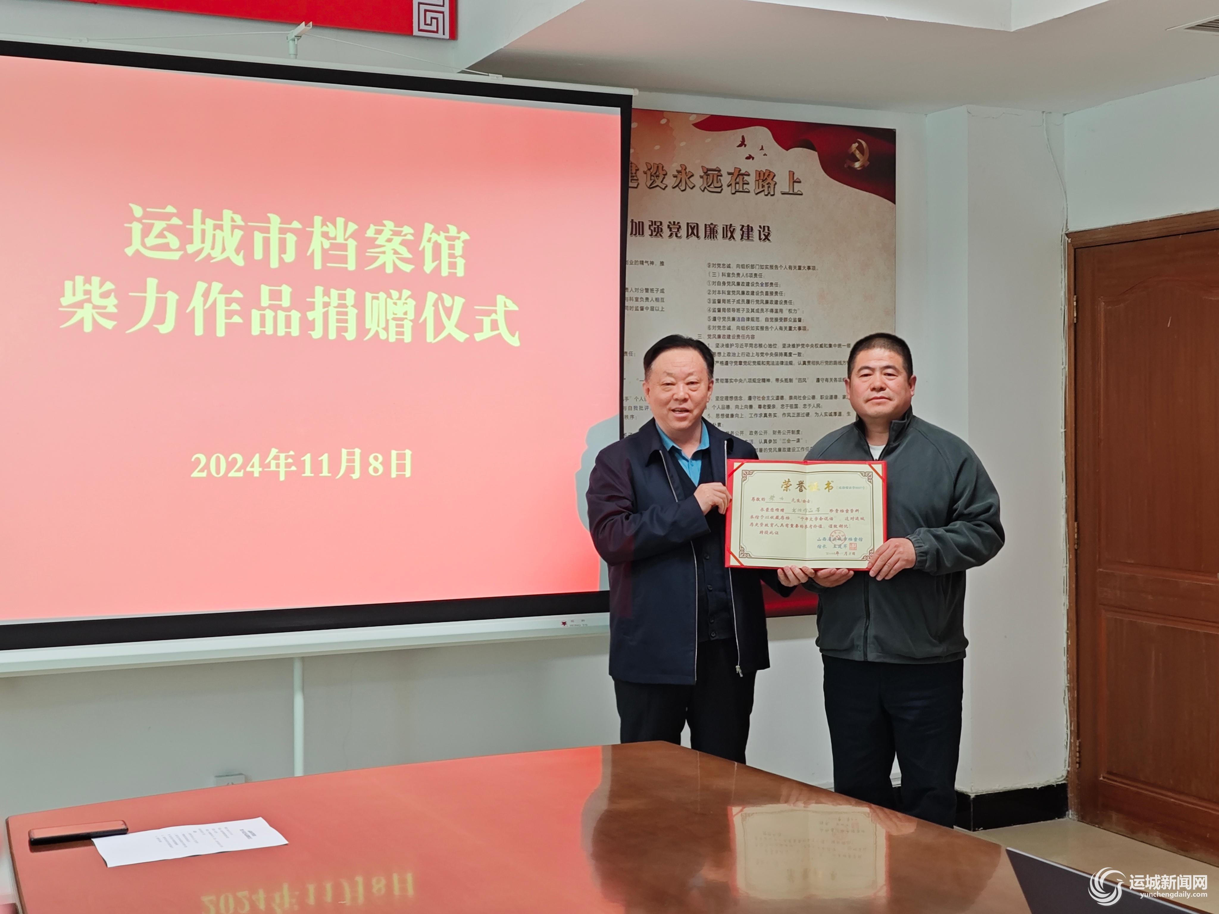 運城晚報訊(記者 王捷)11月8日,市檔案館舉行柴力書法作品捐贈儀式。我市中國書法蘭亭獎獲得者柴力,將自己的系列作品捐贈給市檔案館,支持該館持續推進的名人檔案征集工作。