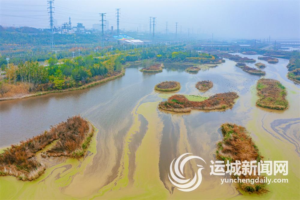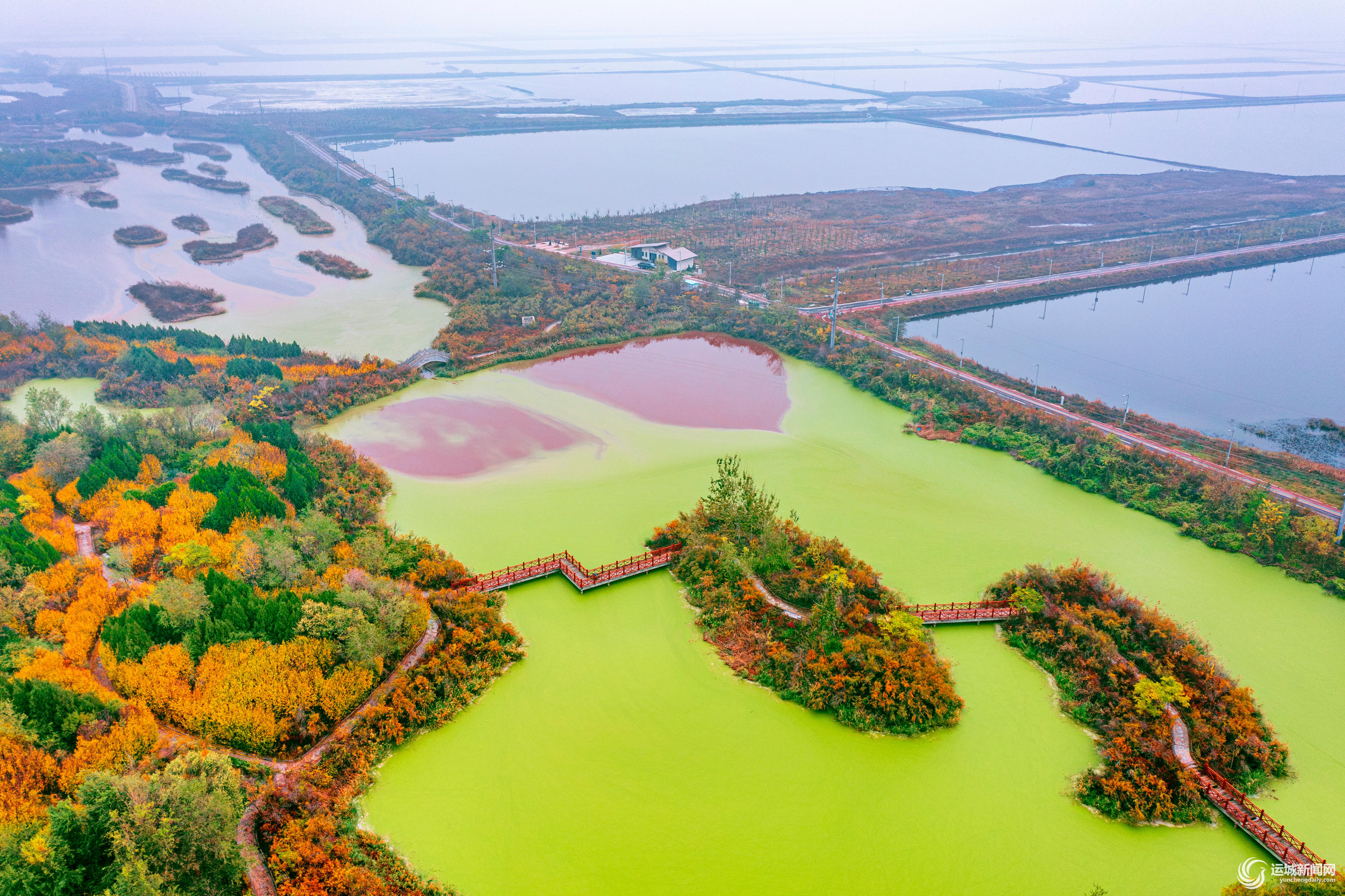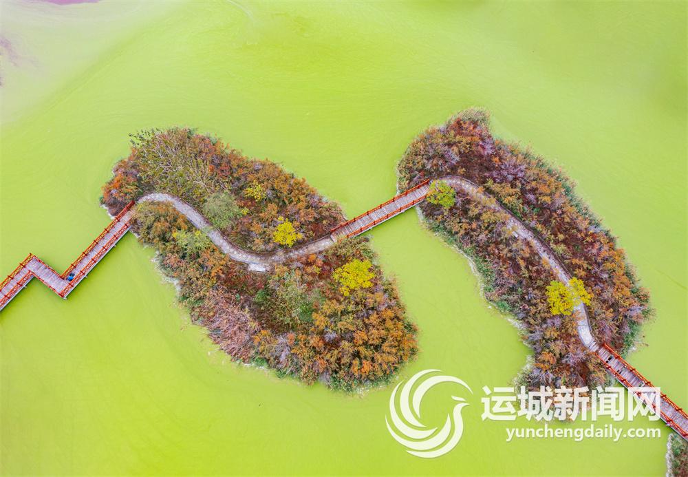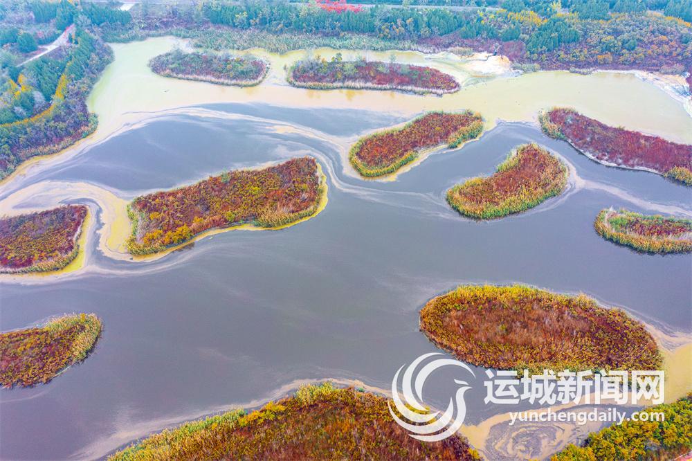 初冬的運城鹽湖,秋色尚未褪盡,色彩斑斕的湖內島嶼星羅棋布、阡陌縱橫。從空中俯瞰,島嶼在湖水映襯下如同多彩“千島湖”,美不勝收。