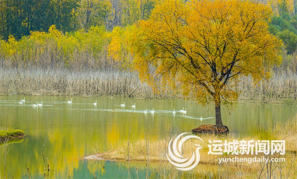 初冬時節,夏縣白沙河濕地公園,白天鵝在嬉戲覓食。白天鵝的到來為風光秀麗、青山綠水的白沙河濕地公園增添了一道亮麗風景線。