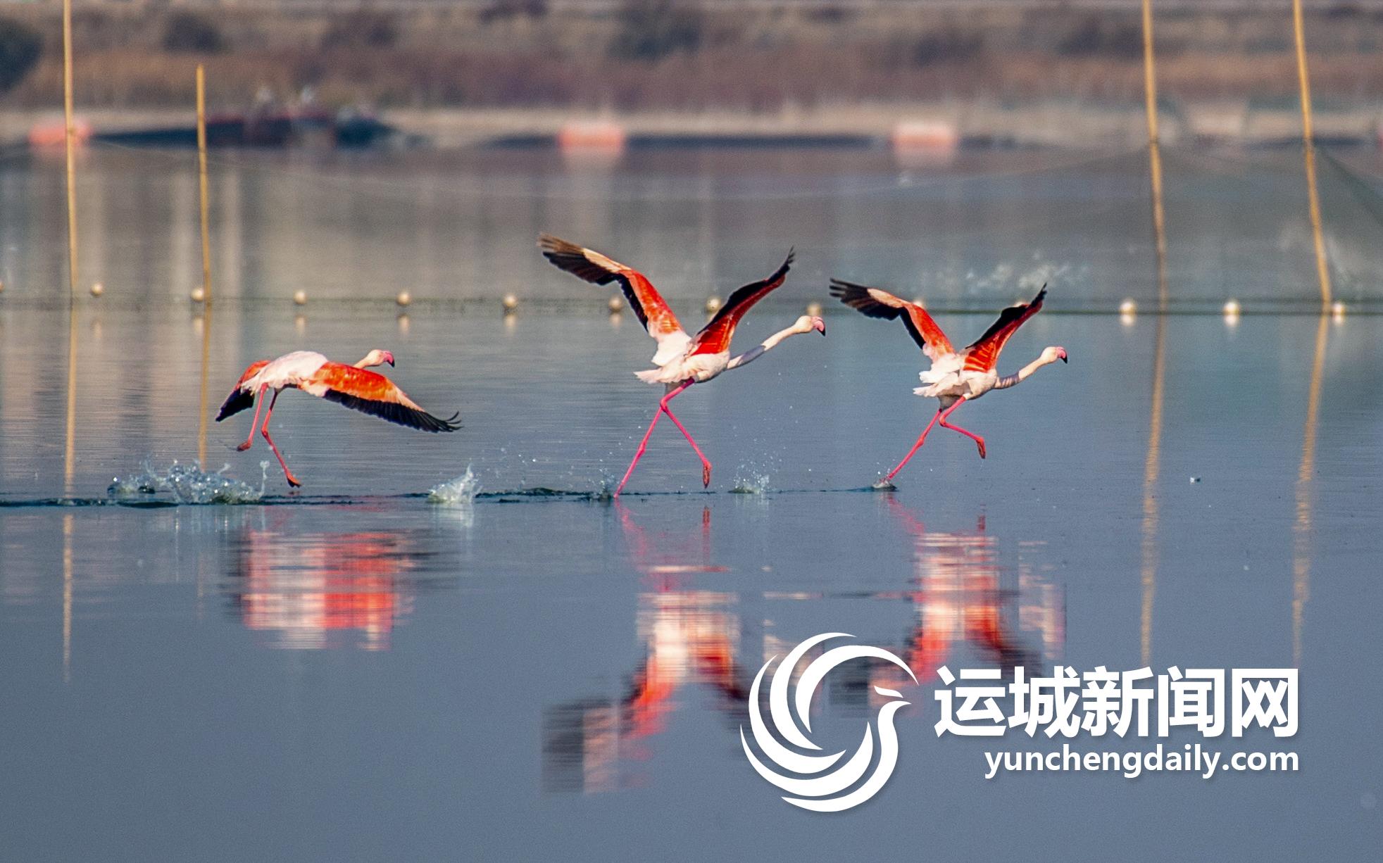 初冬時節,棲息在運城鹽湖的火烈鳥時而覓食、時而嬉戲、時而飛舞,成為一道亮麗的風景線。 記者 薛俊 攝