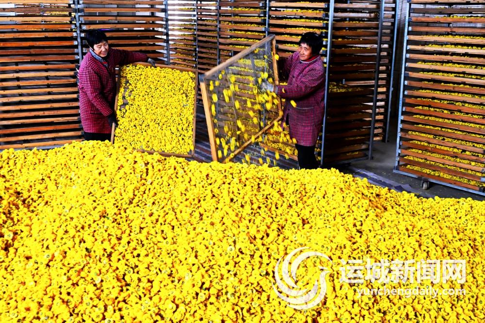 12月3日,在垣曲縣鼎諾種養專業合作社,員工將烘烤好的茶菊集中起來,準備包裝銷售。