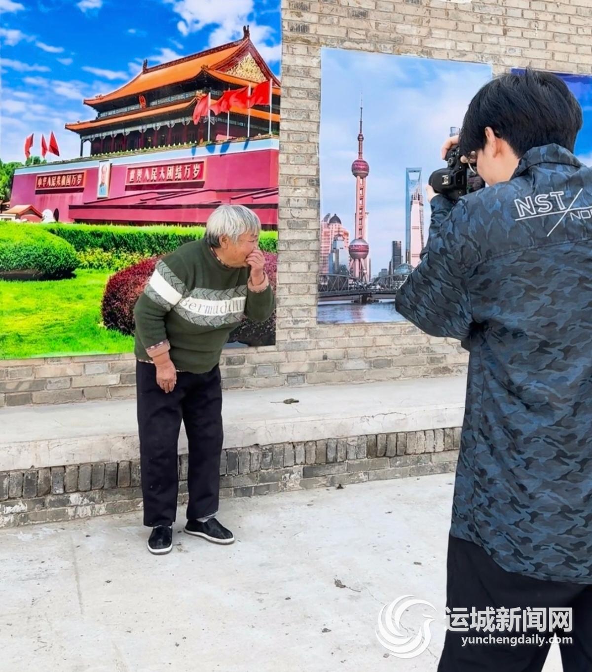 在王怡和打印出來的背景海報里,有北京的天安門、上海的東方明珠,還有廣州的廣州塔。王怡和與同伴將免費拍照的第一站,選在了芮城縣陌南鎮朱呂村。提前聯系好村干部后,他們便前往村里為村民拍照。在村里找一面寬闊的墻,貼上背景圖、調試好相機后,王怡和與同伴便開始在村里尋找想要拍照的老人。