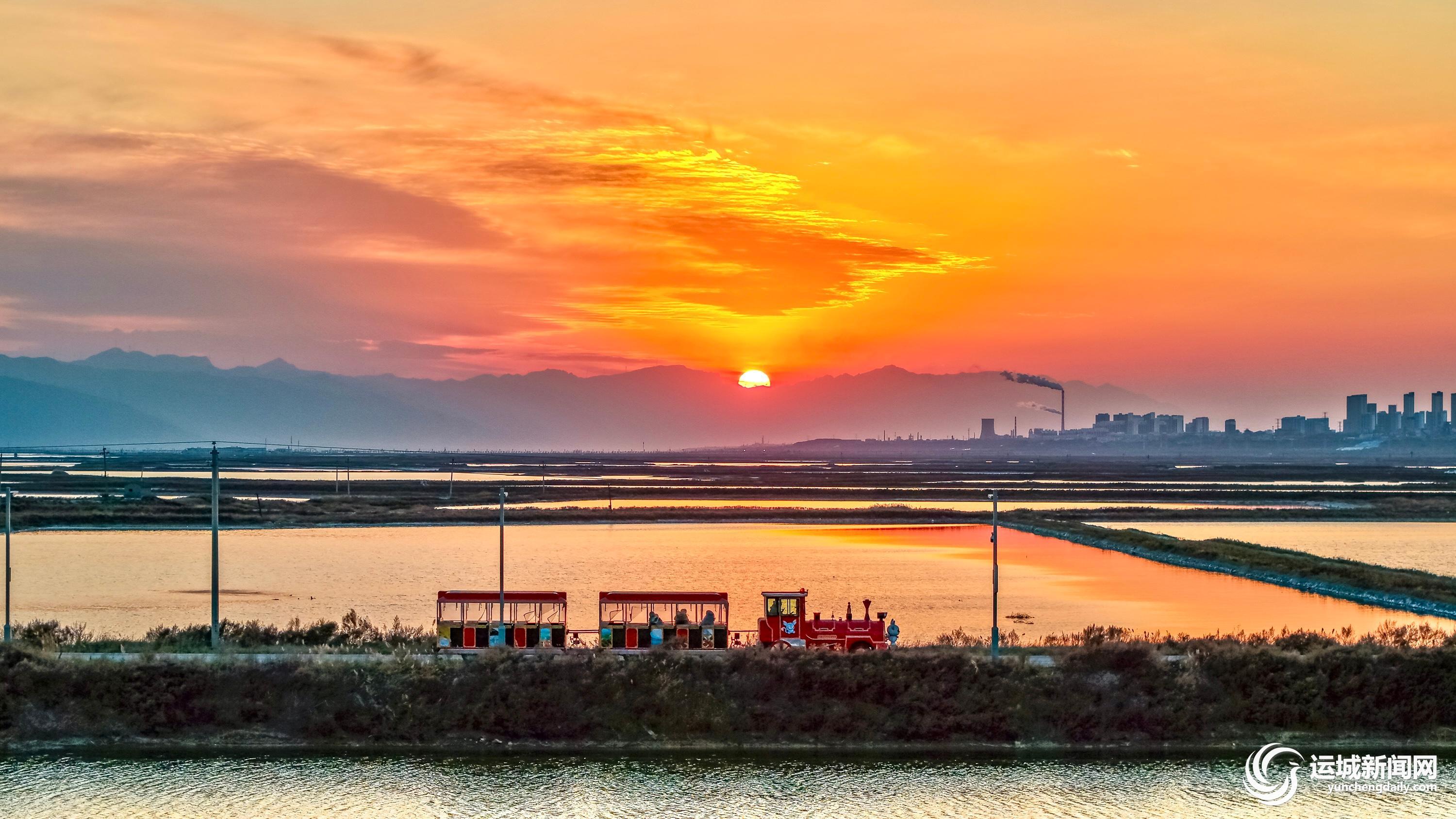 在落日余暉的映襯下,小火車、鹽池構(gòu)成了一幅美麗畫卷。記者陳方斌 攝