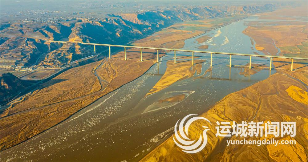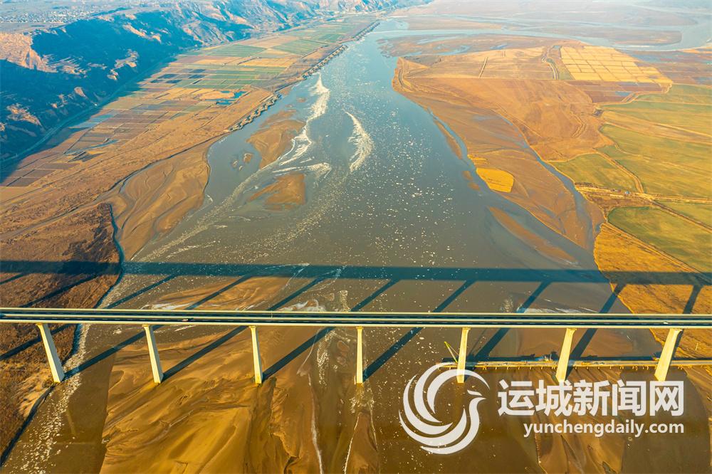 圖為臨猗黃河大橋與流凌景觀交相輝映(12月16日攝)。