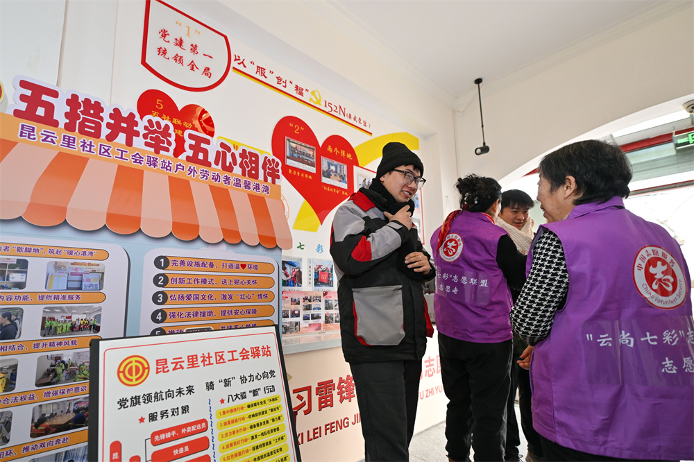 當日,天津市河北區望海樓街道昆云里社區發揮社區志愿服務積極作用,依托工會驛站,組織由社區志愿者組成的愛心針織隊,為新就業群體等戶外勞動者編織暖心圍脖,傳遞社區居民對他們的關心關愛。