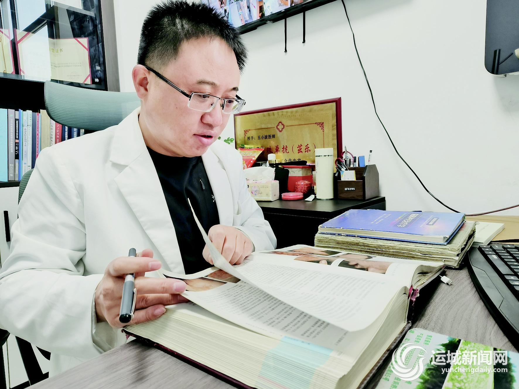 “你這個(gè)是尋常痤瘡,是皮膚科最常見的慢性炎癥性毛囊皮脂腺疾病……要是還有疑問,可以看看我這本書1165頁的內(nèi)容,對(duì)病癥有個(gè)更全面的認(rèn)識(shí),也能大概了解我的治療方案。”近日,在位于河津市區(qū)的王小波皮膚病診所,負(fù)責(zé)人王小波認(rèn)真為一位患者診療。