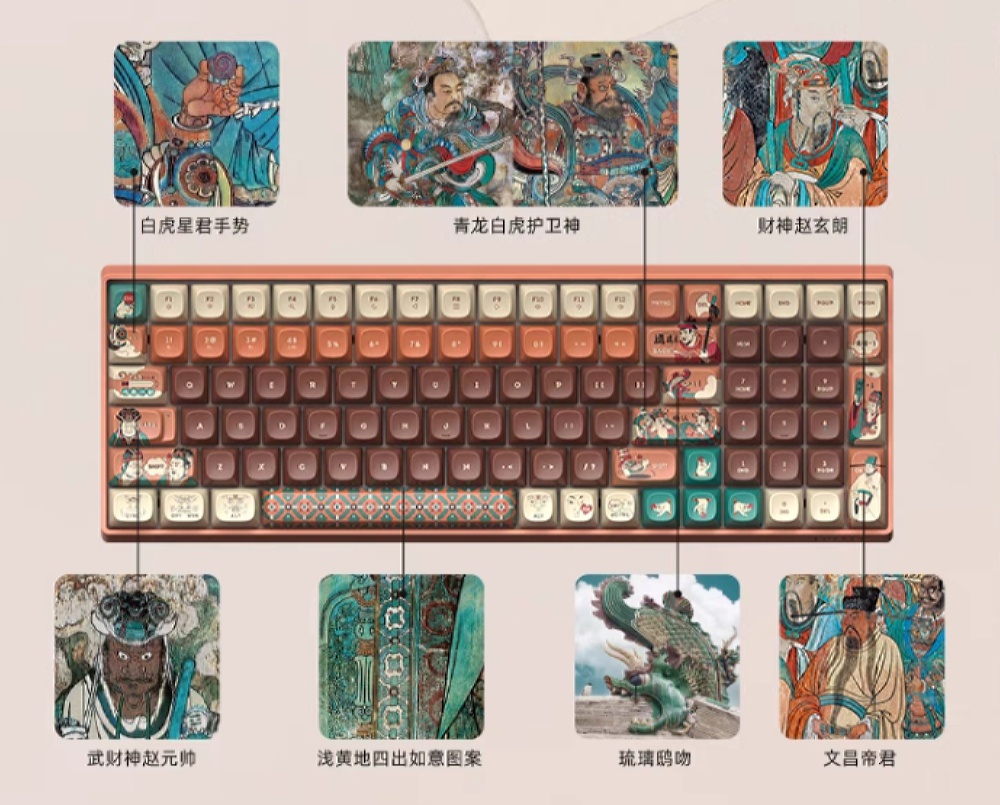 這款鍵盤融合永樂宮建筑及壁畫元素,使壁畫中的眾多神仙人物一“鍵”下凡,與大家親密互動(dòng)。此外,根據(jù)人物形象,鍵盤中還配有個(gè)性化表情包與語言,趣味滿滿。