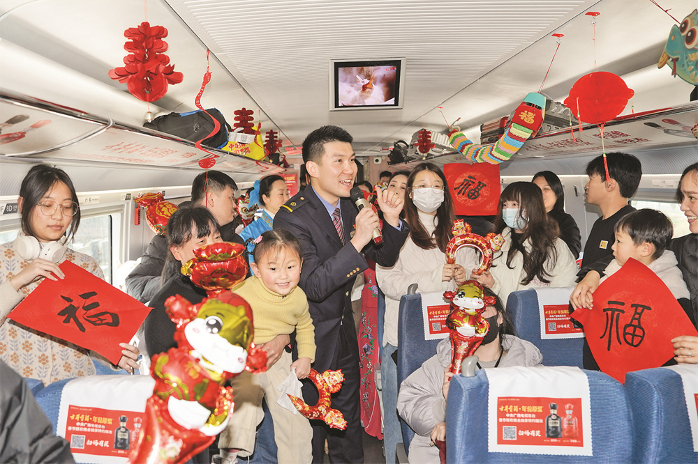 1月13日,在C3685次列車上,旅客與乘務(wù)人員互動(dòng)。