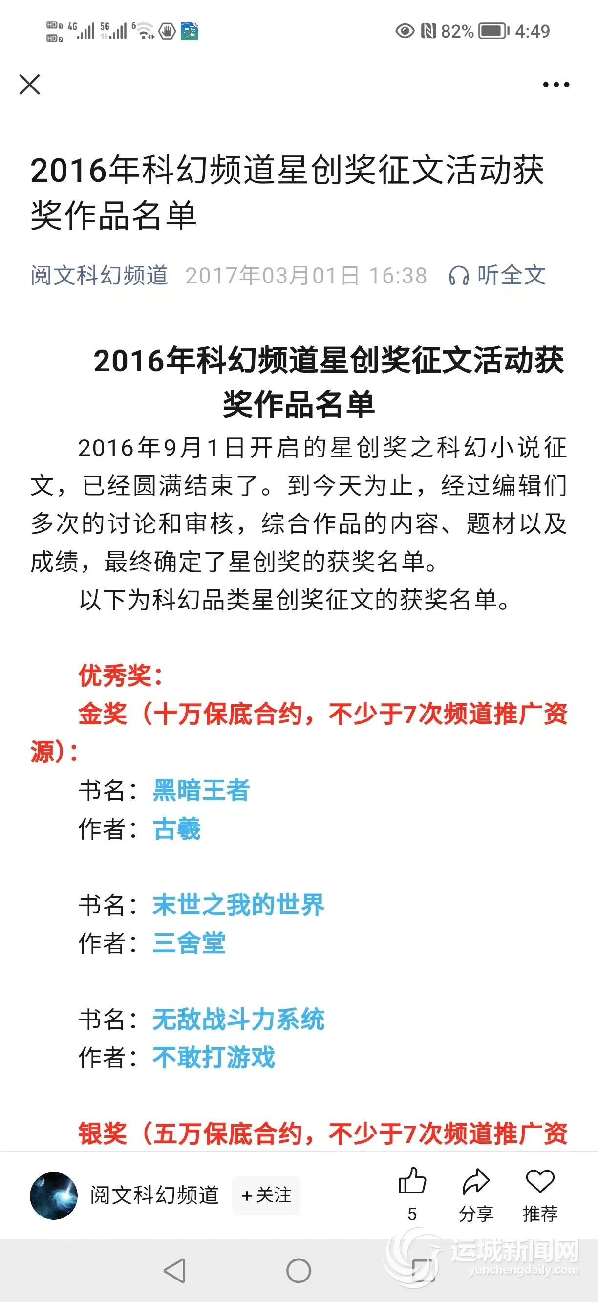 像哪吒一樣,他東沖西突,以驚人的毅力與靈性,在網絡文學創作上闖出了一條科幻網絡小說寫作之路。他的作品由起點中文網等大型門戶網站推薦,在閱讀排行榜上名列前茅。他在虛擬的網絡文學世界寫出了運城文學的高光時刻。