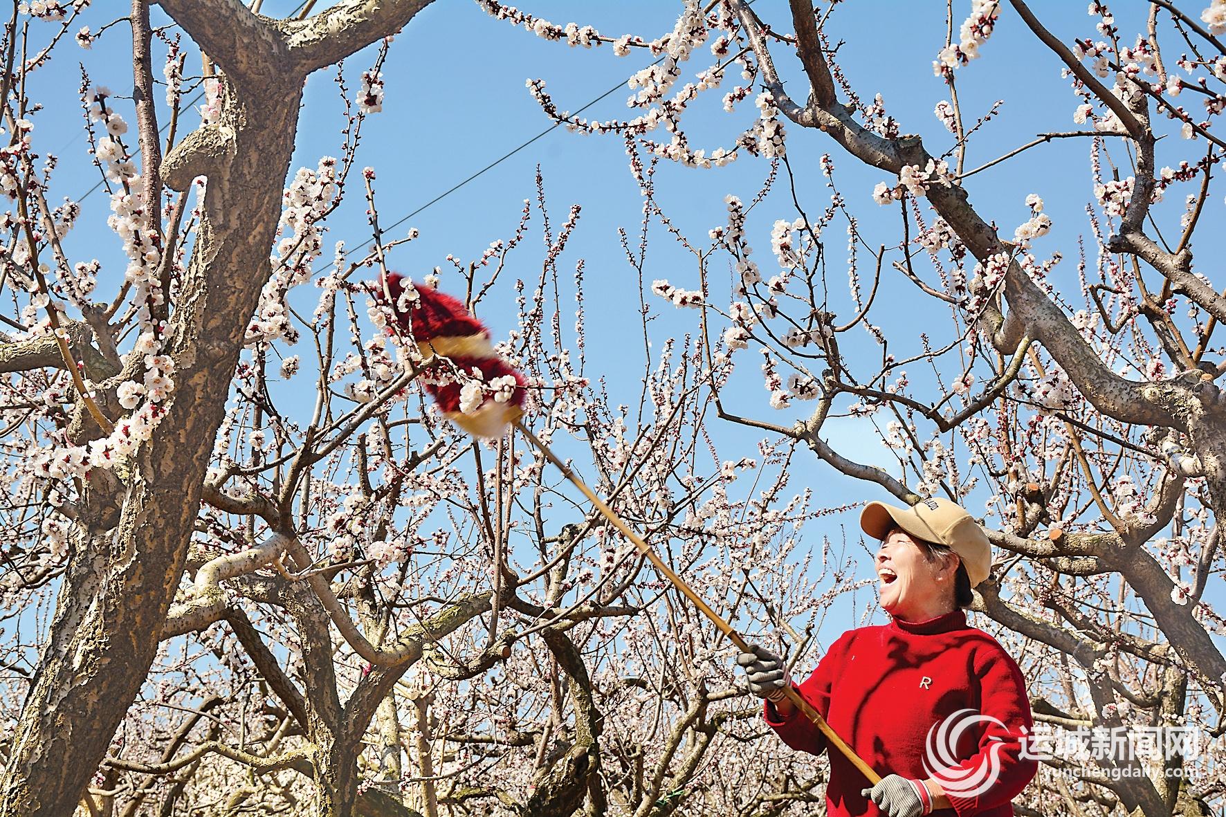 3月16日,永濟市城西街道西姚溫村村民在給杏花進行人工授粉。