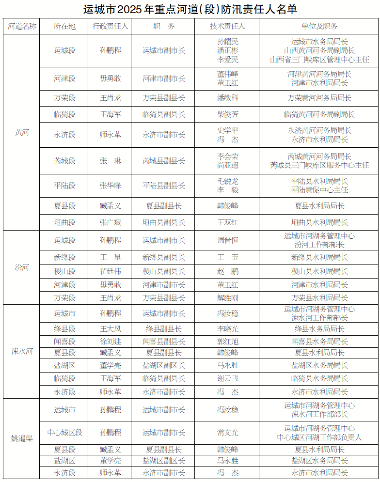 為全面做好2025年我市防汛抗旱工作,確保安全度汛,根據(jù)《中華人民共和國(guó)防洪法》《中華人民共和國(guó)防汛條例》《中華人民共和國(guó)抗旱條例》和國(guó)家防總關(guān)于《各級(jí)地方人民政府行政首長(zhǎng)防汛抗旱工作職責(zé)》的規(guī)定,結(jié)合我市實(shí)際情況,現(xiàn)將市、縣兩級(jí)防汛抗旱責(zé)任人、全市中型水庫(kù)、重點(diǎn)河道(段)、重點(diǎn)防洪城市和縣城、苦池蓄滯洪區(qū)、鹽湖和鴨子池等防汛抗旱責(zé)任人予以公示。