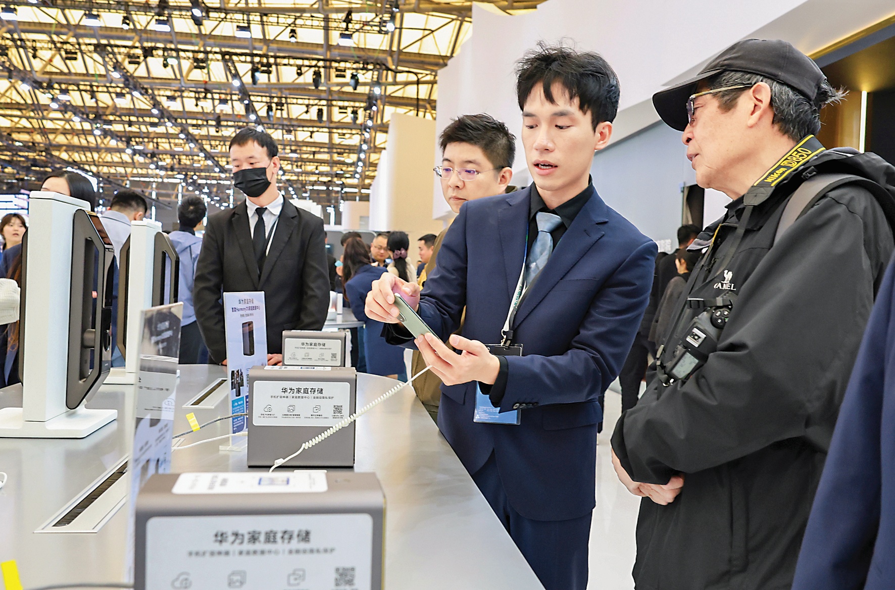 3月20日,工作人員(右二)在向參觀者介紹一個(gè)家庭數(shù)據(jù)中心存儲(chǔ)設(shè)備。