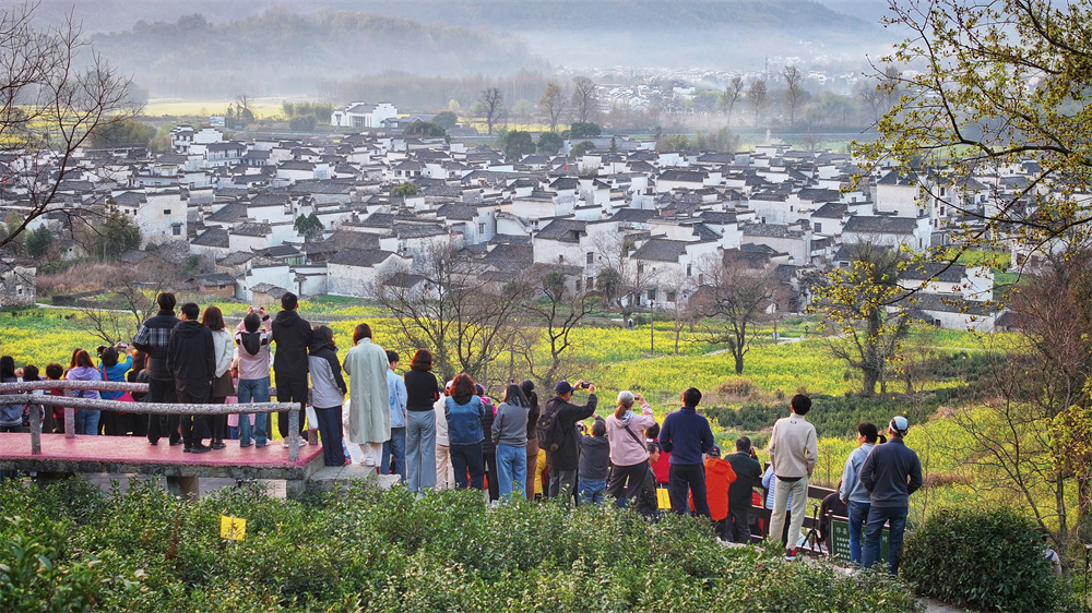 3月25日,游客在安徽省黃山市黟縣宏村鎮(zhèn)盧村拍攝油菜花田和徽派古民居。春和景明,人們走出家門,賞花游玩,樂享春日時光。 新華社發(fā)