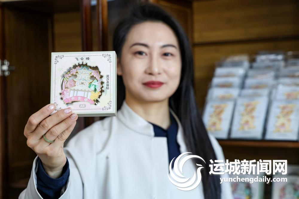 還有以飛云樓的春天為主題的流沙冰箱貼,搭配流沙花瓣,再融入AR技術,一掃就能看到飛云樓的實景動畫。獨特的設計和新穎的玩法,讓這些產品一經推出,便受到大家的喜愛。今年春節在飛云樓前擺攤時,就有回鄉大學生專門跑到她們的小攤前,購買了十幾份文創產品,要送給朋友們。“我希望這些帶有標識性的文創產品,讓人們一看就能想到是萬榮的飛云樓,也能讓年輕人在其中能感受到傳統文化的魅力。”她說。