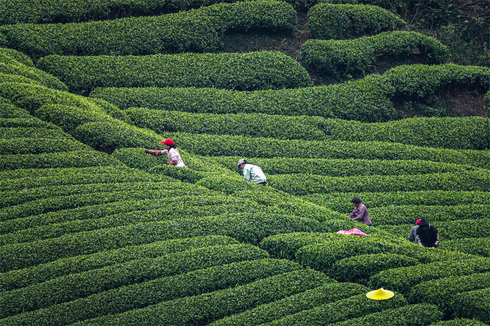 4月5日,茶農在廣西賀州市昭平縣高山生態茶園采摘春茶。 清明時節是春茶采摘旺季,茶農在茶園內忙碌,采制新茶供應市場。 新華社發(喻湘泉 攝)
