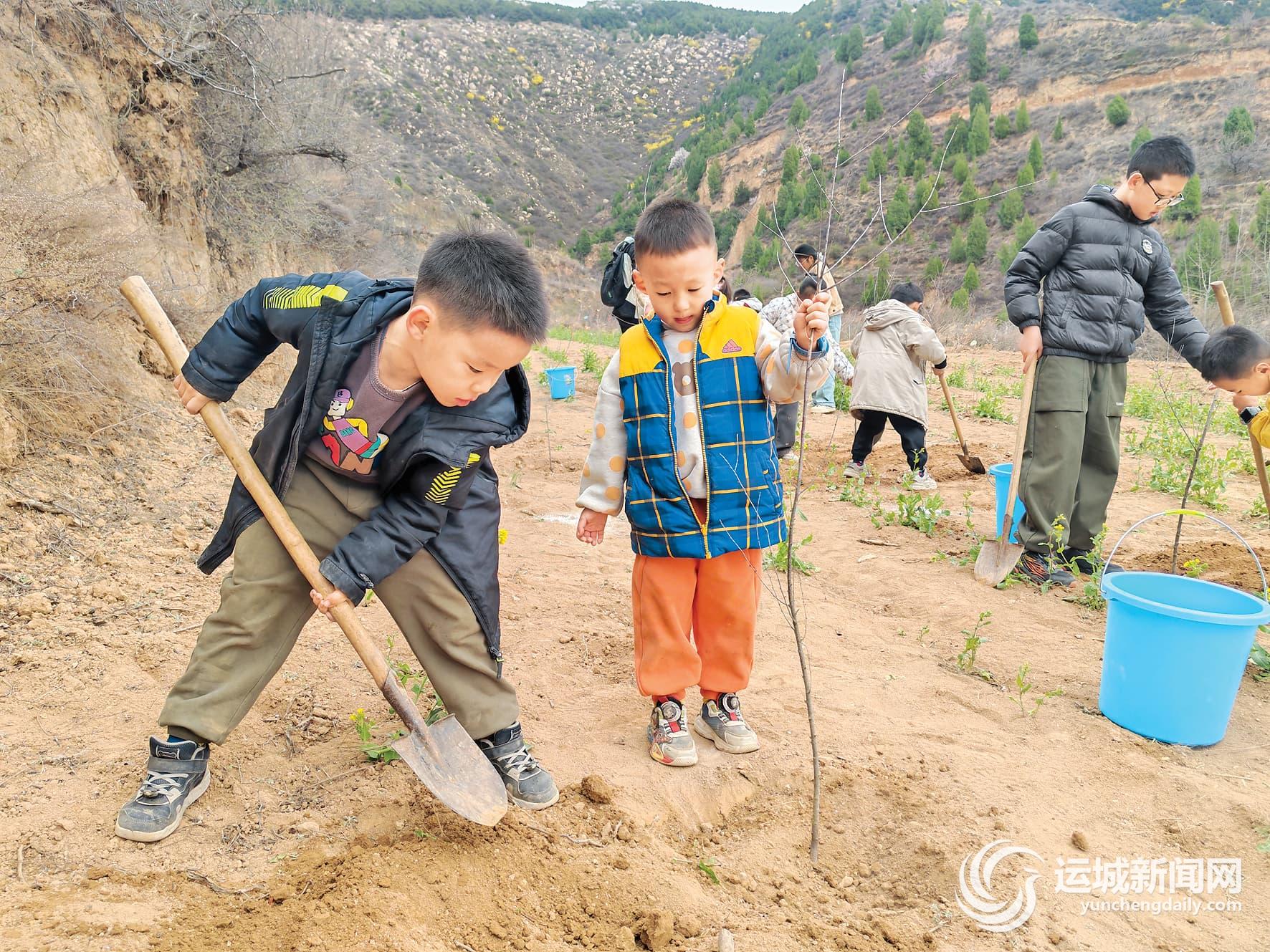 孩子們認真聆聽,不時提問互動。隨后,帶著鐵鍬、水桶與山桃樹苗,他們分組行動。挖坑、栽苗、填土、澆水,每個環節都有講究。