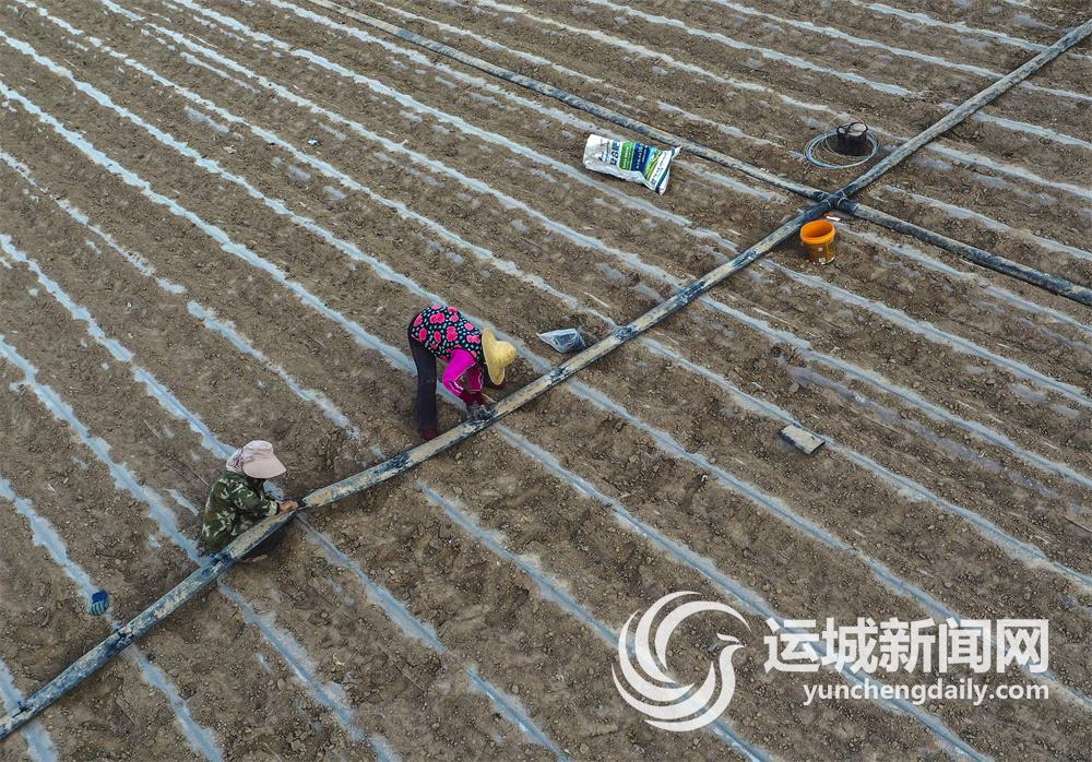 4月8日,在萬榮縣南張鄉薛里村中藥材生產基地,專業人員在連接滴灌輸水管網,準備進行滴灌。