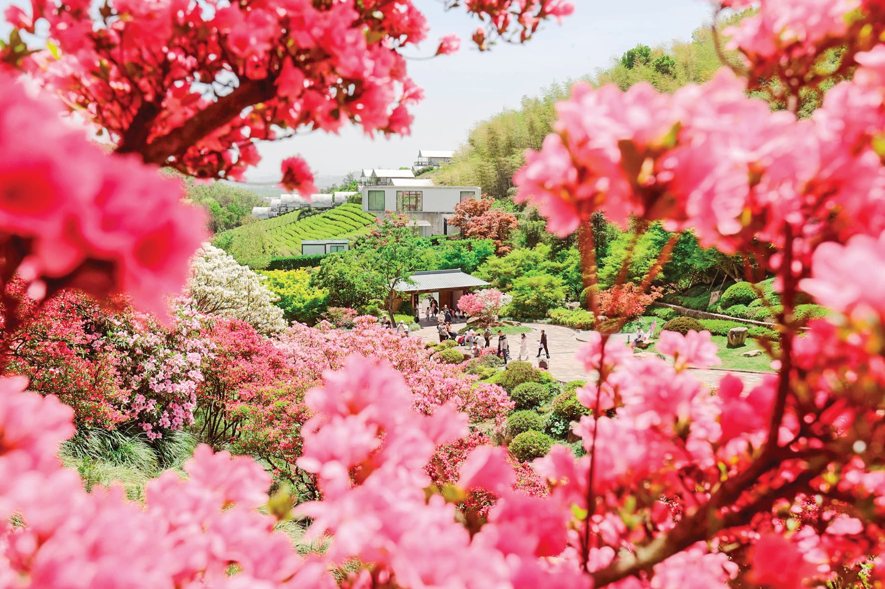 4月13日,游客在浙江省湖州市德清縣下渚湖奇幻谷杜鵑花海中漫步游玩。 新華社發(謝尚國 攝)