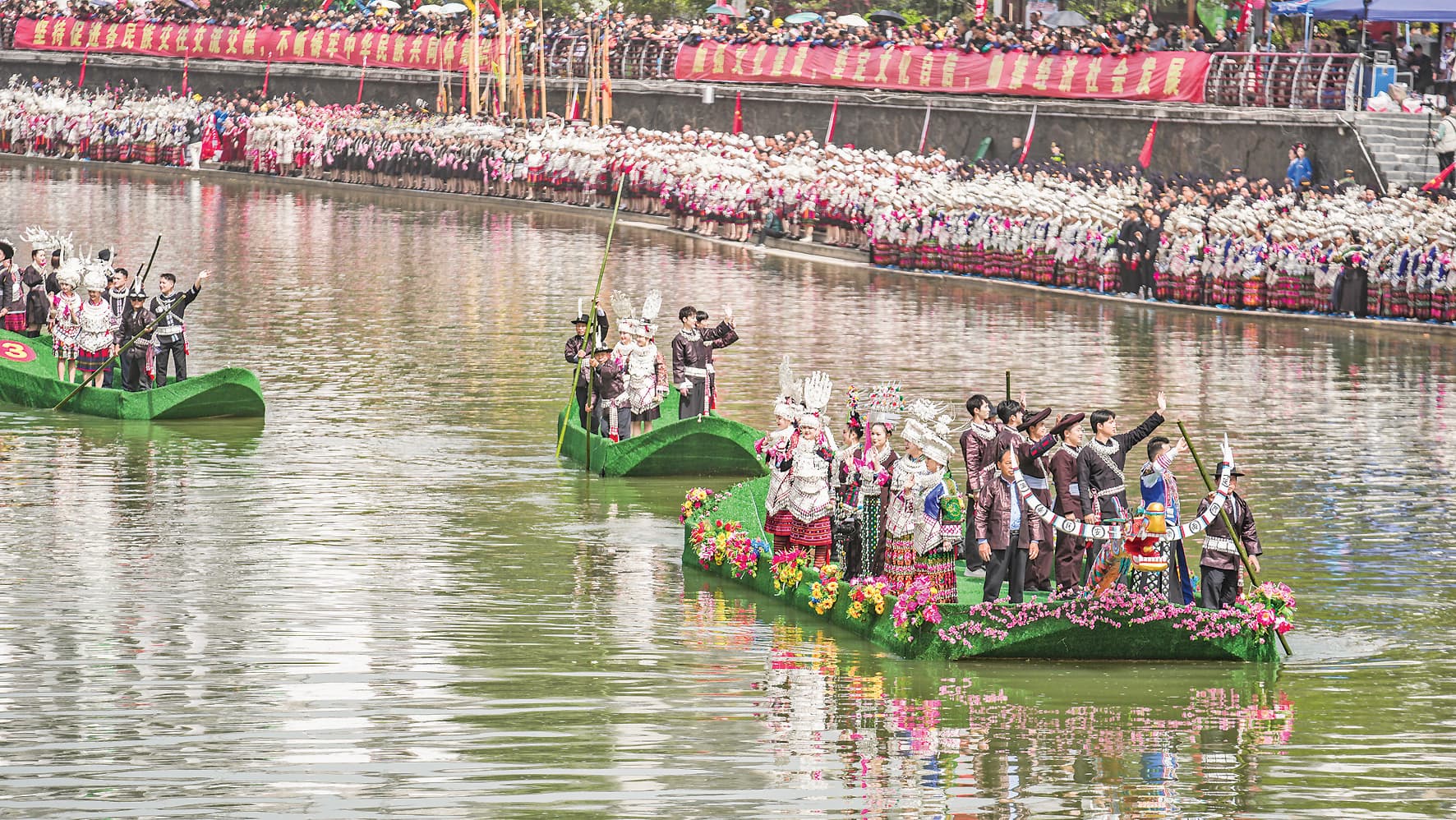 4月13日,貴州臺江縣當地群眾參加苗歌對唱活動。 當日,2025年苗族姊妹節苗歌對唱活動在貴州臺江縣翁你河畔舉行。臺江縣的萬余名苗族群眾,身著節日盛裝齊聚河畔,以傳統對唱的方式,向游客展現苗族飛歌、情歌,歡慶姊妹節。 新華社記者 陶 亮 攝