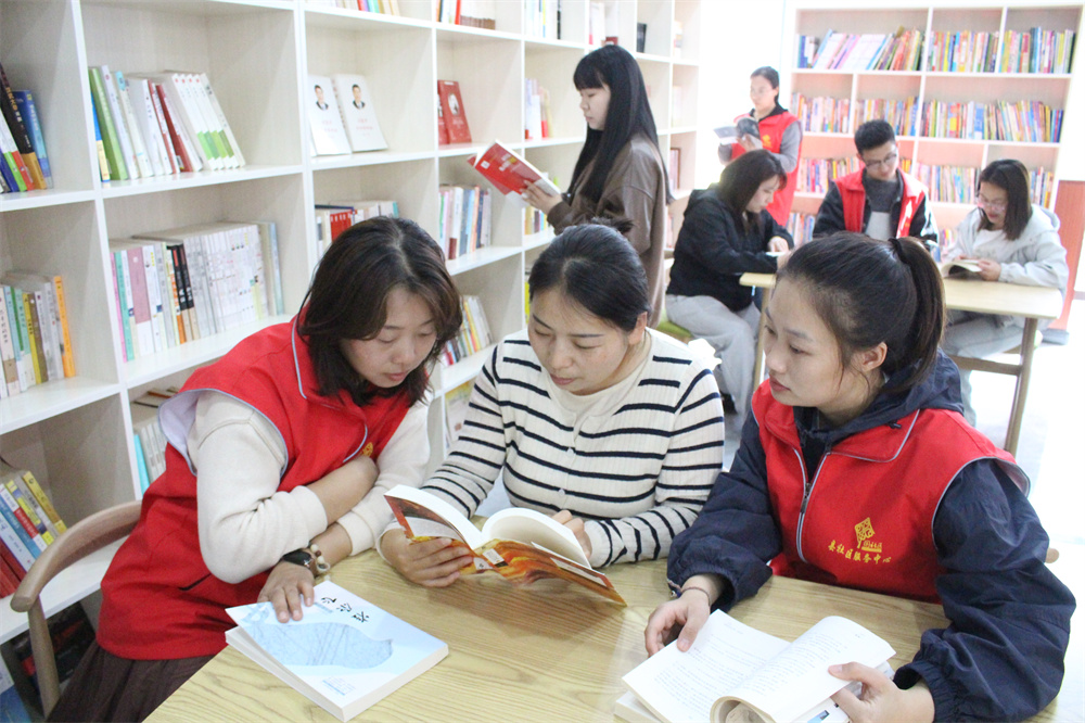 4月16日,聞喜縣社區服務中心東城社區工作人員和居民在河東書房內閱讀。