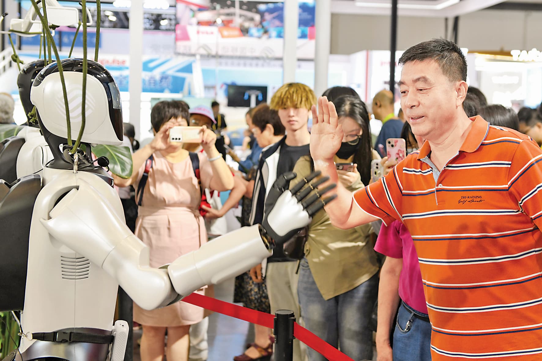 4月17日,觀眾在消博會中國移動展臺與機器人擊掌互動。 當日,第五屆消博會迎來公眾開放日,科技、康養、文化、旅游、體育等領域的消費精品與服務產品與公眾見面。 新華社記者 孫笑天 攝