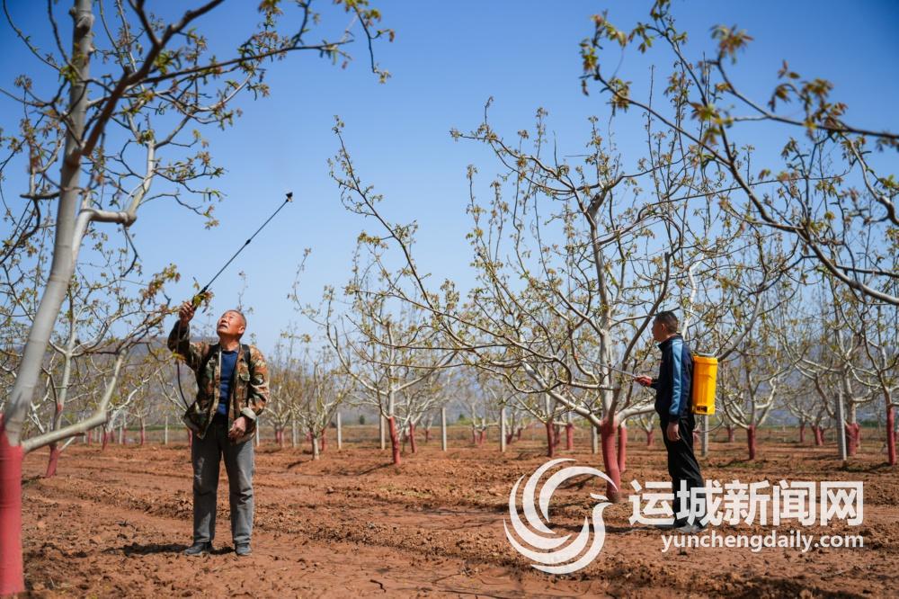 走進華峰鄉(xiāng)黃河村核桃種植示范園,一派生機勃勃的春景映入眼簾。核桃樹枝頭新芽萌發(fā),部分已結出青豆般大小的果實。兩名工人正忙著為核桃樹噴施水溶肥,樹干統(tǒng)一涂刷的紅色長效保護劑,成為春日林間一道獨特的風景線。