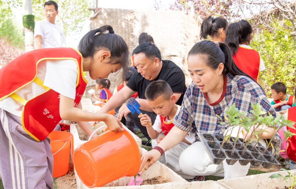 4月23日,夏縣埝掌鎮中心幼兒園開展“春來夏都、綠滿校園”活動,師生們共同栽種菜苗、粉刷樹木。 特約攝影 姚中吉 攝