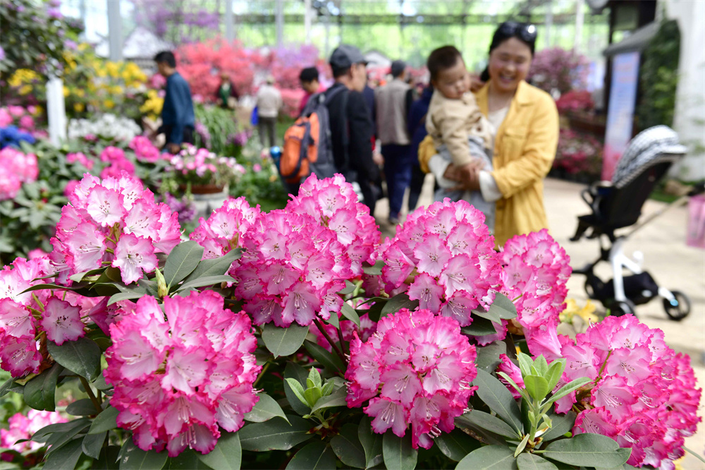4月28日,在中國杜鵑花博覽園,游客在游園賞花。